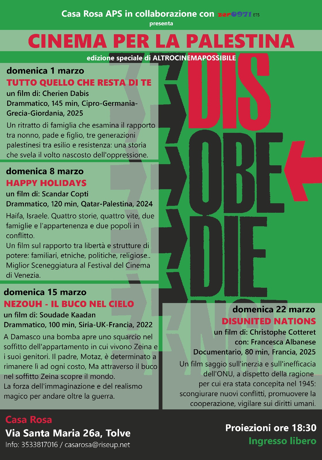 Per quattro domeniche di Marzo proietteremo a Casa Rosa e attiveremo anche una raccolta fondi a favore di Gazzella Onlus, in sostegno alla popolazione di Gaza.